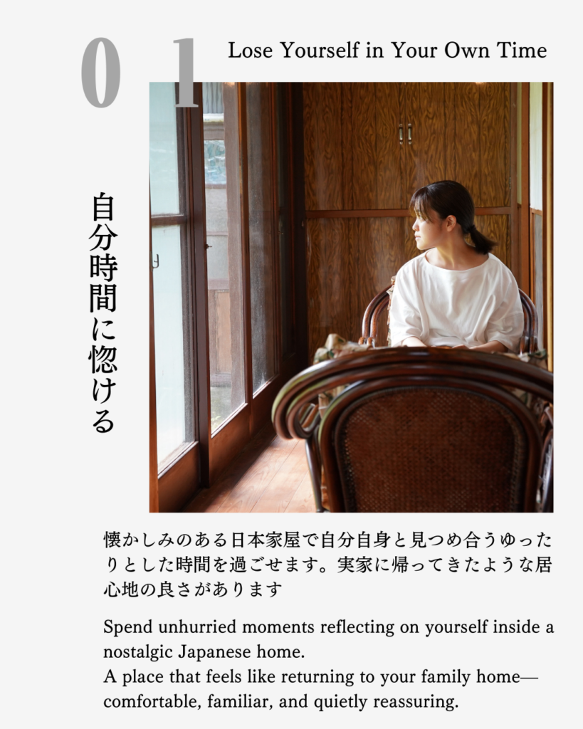 A renovated Japanese home over 60 years old, designed around the idea of preserving what already exists. A spacious living room with antique furniture, a generous kitchen, and quiet spaces for personal time. A place to slow down—and simply be.